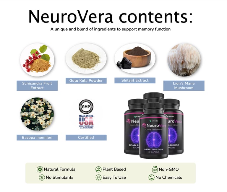 NeuroVera is a thoughtfully crafted supplement made with a unique blend of carefully selected ingredients, designed to help support memory function and contribute to overall brain health.